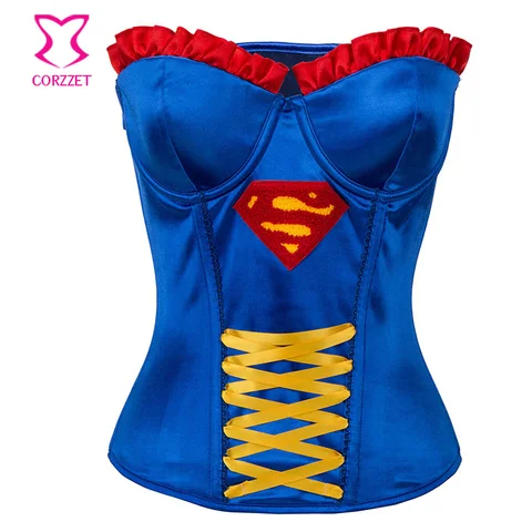 Sexy Blue Superwoman Ruffle Satin Corset Steampunk Push Up Korsett For Women Plus Size Gothic Clothing Burlesque Bustier Tops XL