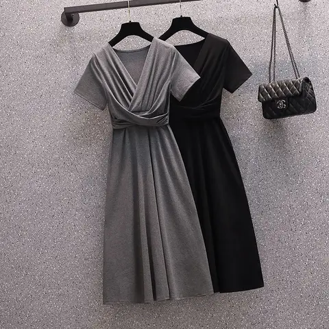 Large Size Women's Summer Suit Female 2021 New Temperament Western Style Slimming Pleated Pure Color All-Matching Simple Dress