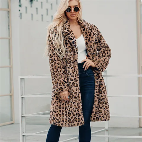 F0208 New Fashion Winter Clothing Plus Size Long Leopard Print Suit Collar Faux Fur Overcoat Women's Casual Trench Coat