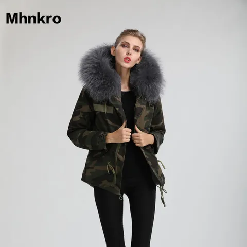 2018 Mhnkro Camouflage Shell winter thickness grey furs lined short fur jacket with removeable huge real fur hoodies plus size