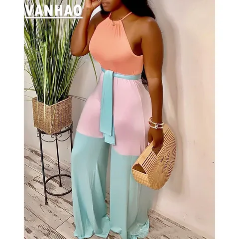 VANHAO Summer New Women Fashion Contrast Color Bandage Long Jumpsuit Ladies Sexy Halter Skinny Romper Wholesale