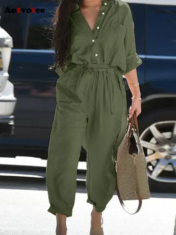 Aotvotee Solid Jumpsuits for Women New Fashion Vintage Belt Long Sleeve Loose Overalls Chic Streetwear Tie-up Belt Cargo Pants
