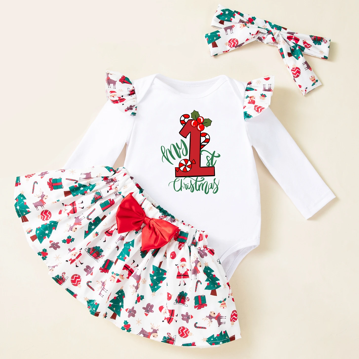 Dress your little one in festive style with this adorable white Christmas bodysuit paired with a green tree tutu skirt and headband. Perfect for a cozy Christmas celebration or a sweet New Year party.