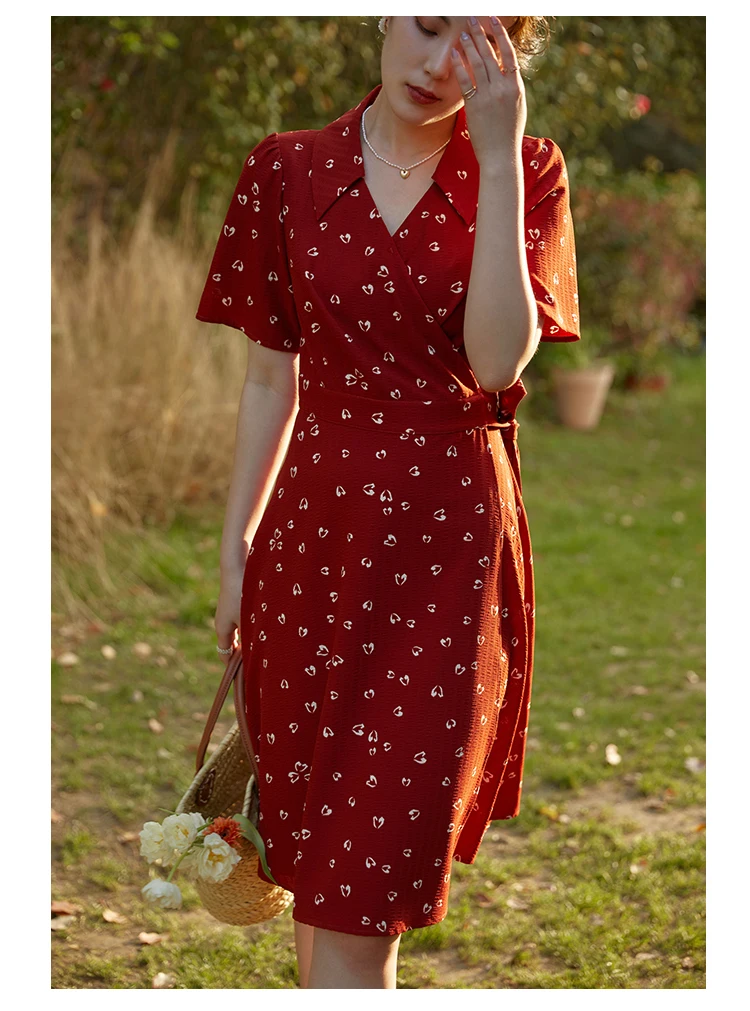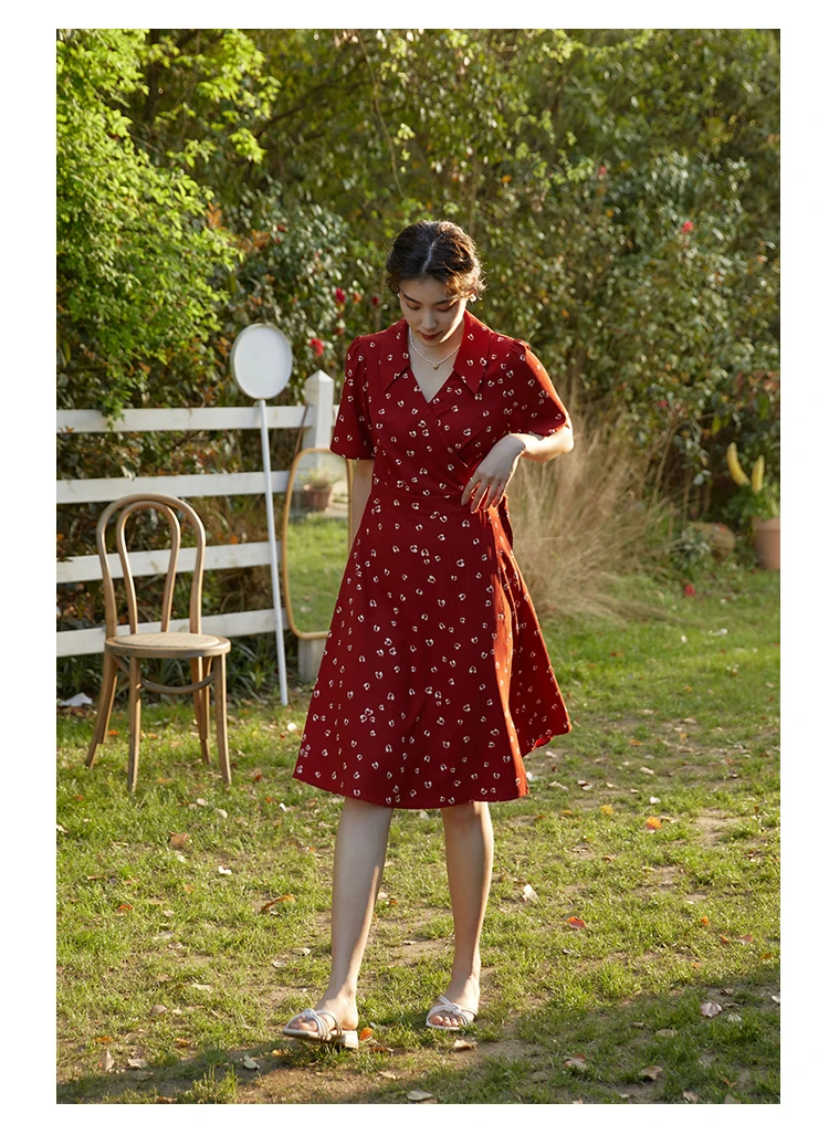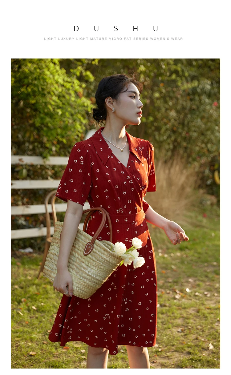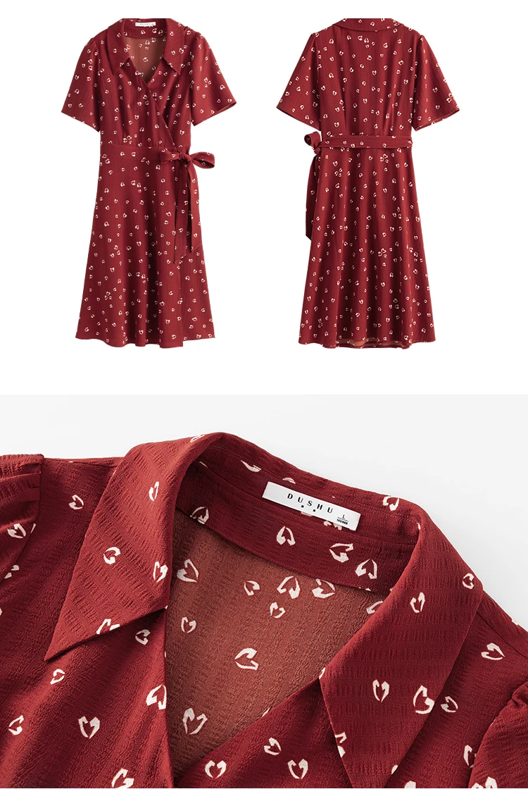 DUSHU Women Dress Summer Retro Red Floral Chiffon Dress Office Lady Short Sleeve A-LINE Skirt Clothes For Women Print Dresses