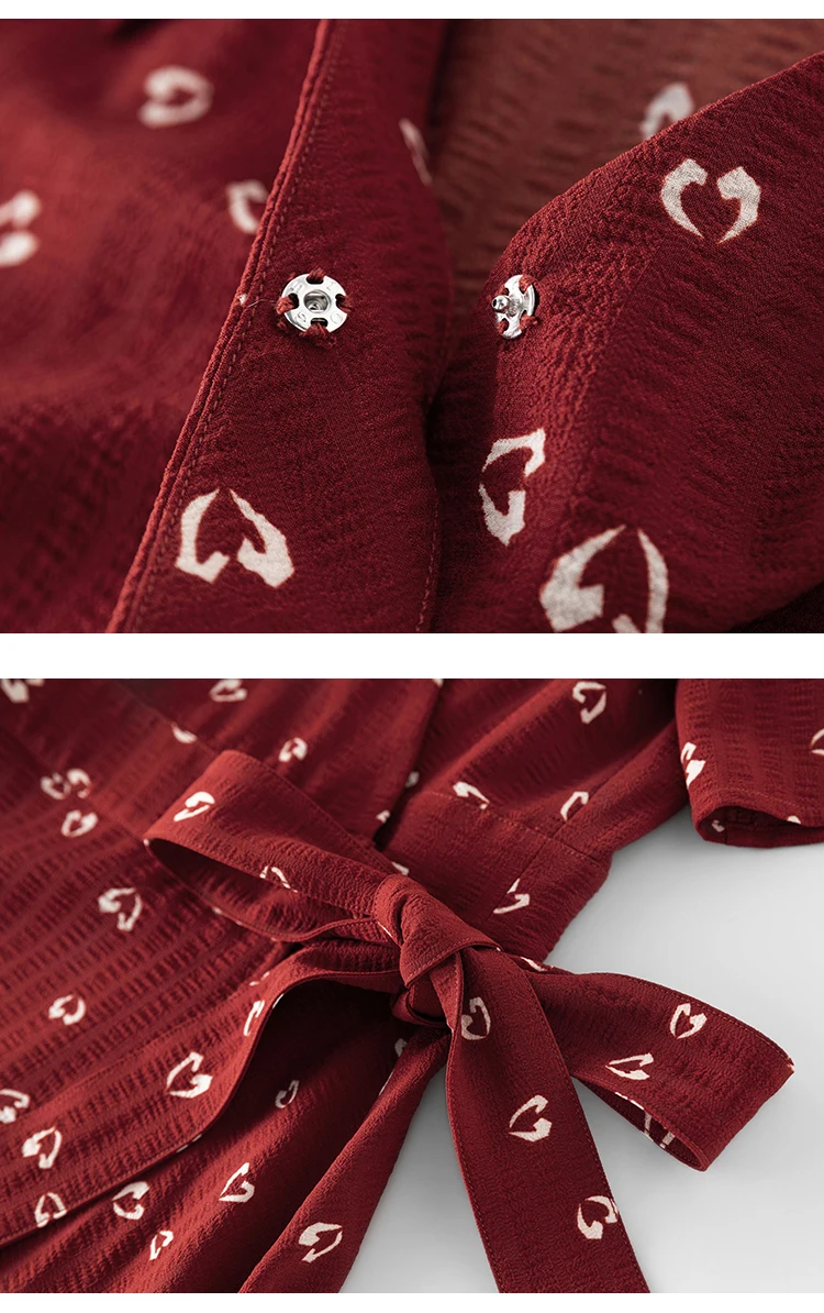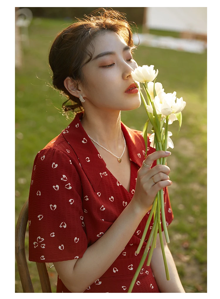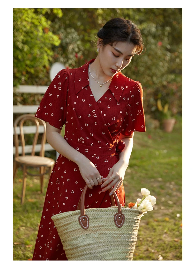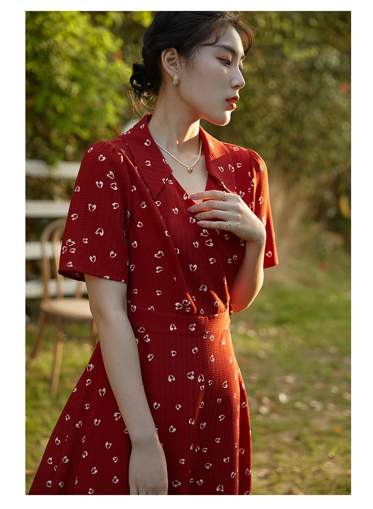 DUSHU Women Dress Summer Retro Red Floral Chiffon Dress Office Lady Short Sleeve A-LINE Skirt Clothes For Women Print Dresses