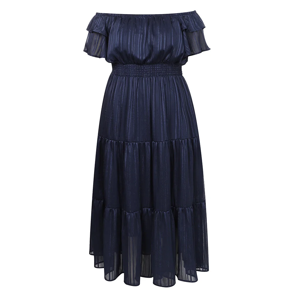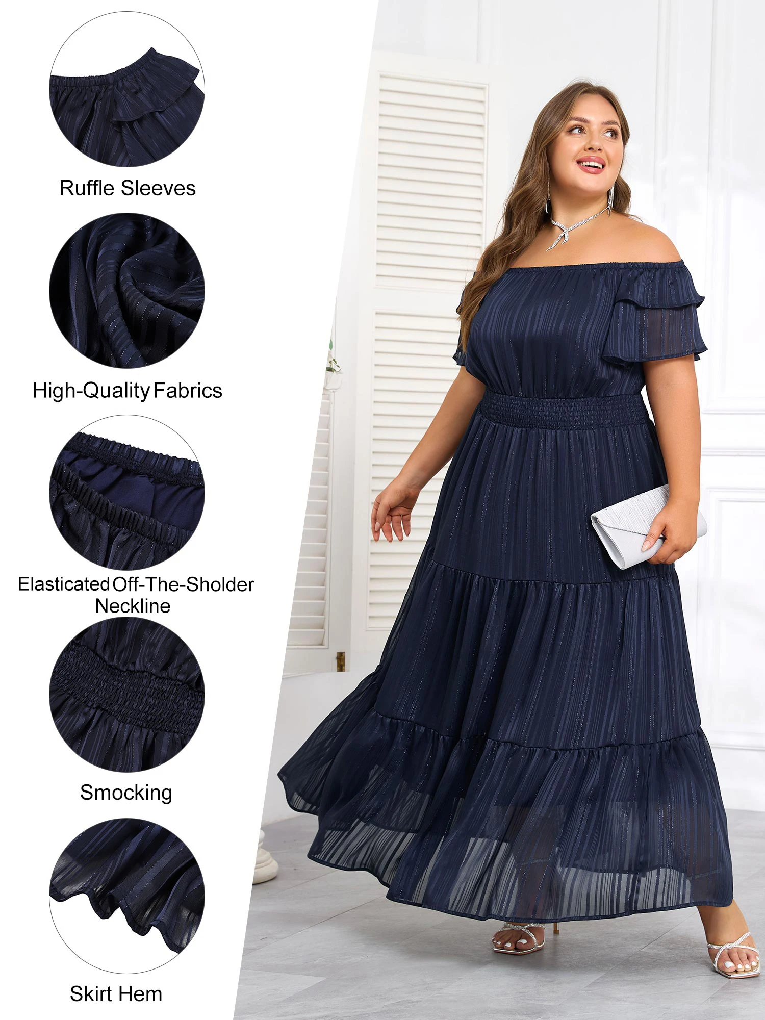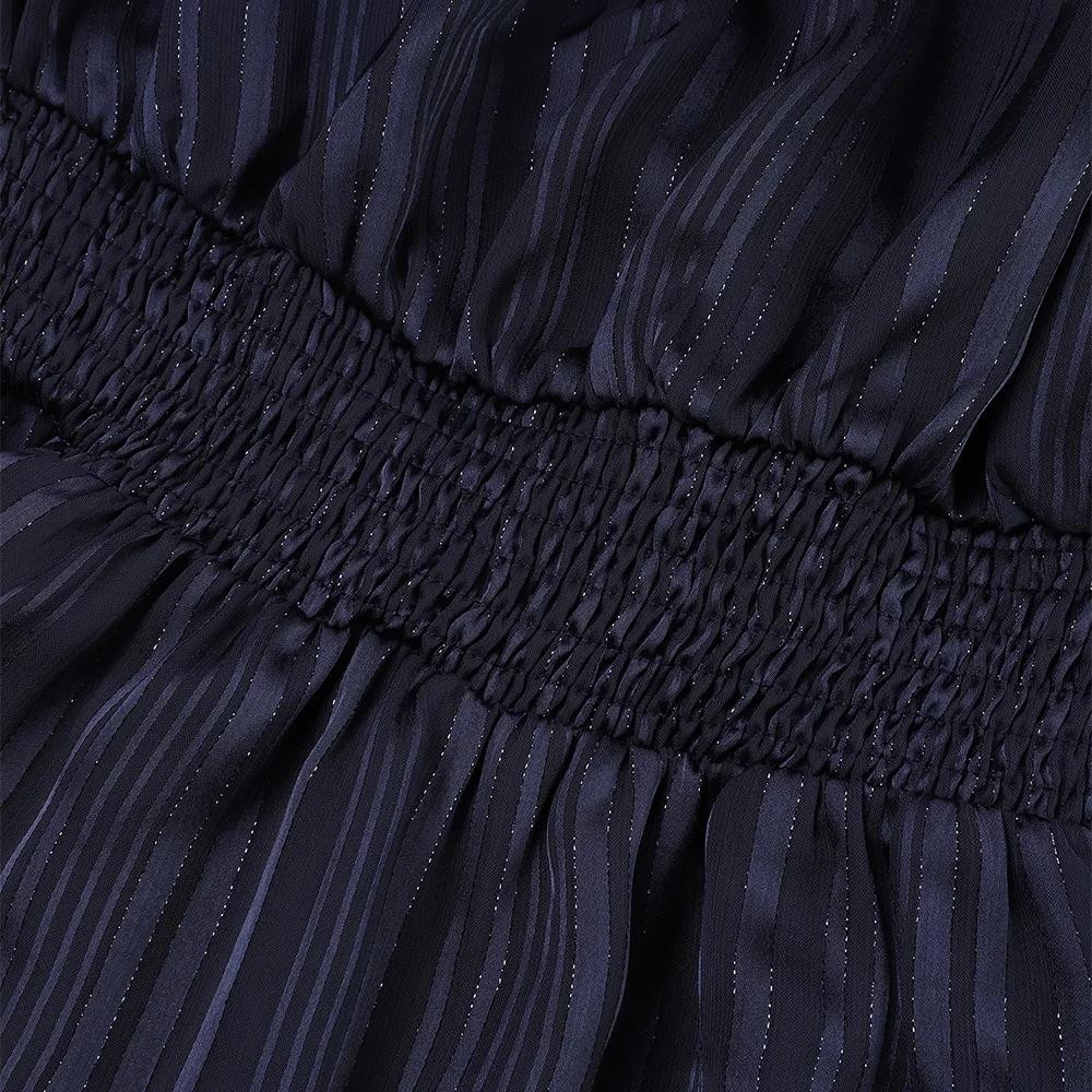 Get ready to make a statement in this elegant pinstripe butterfly sleeve maxi dress that’s perfect for parties and evening events. Made of polyester with a woven fabric type, this dress features a slash neck and elastic waist for a comfortable fit.