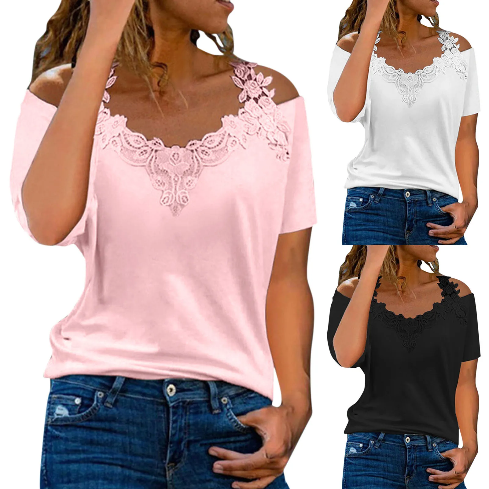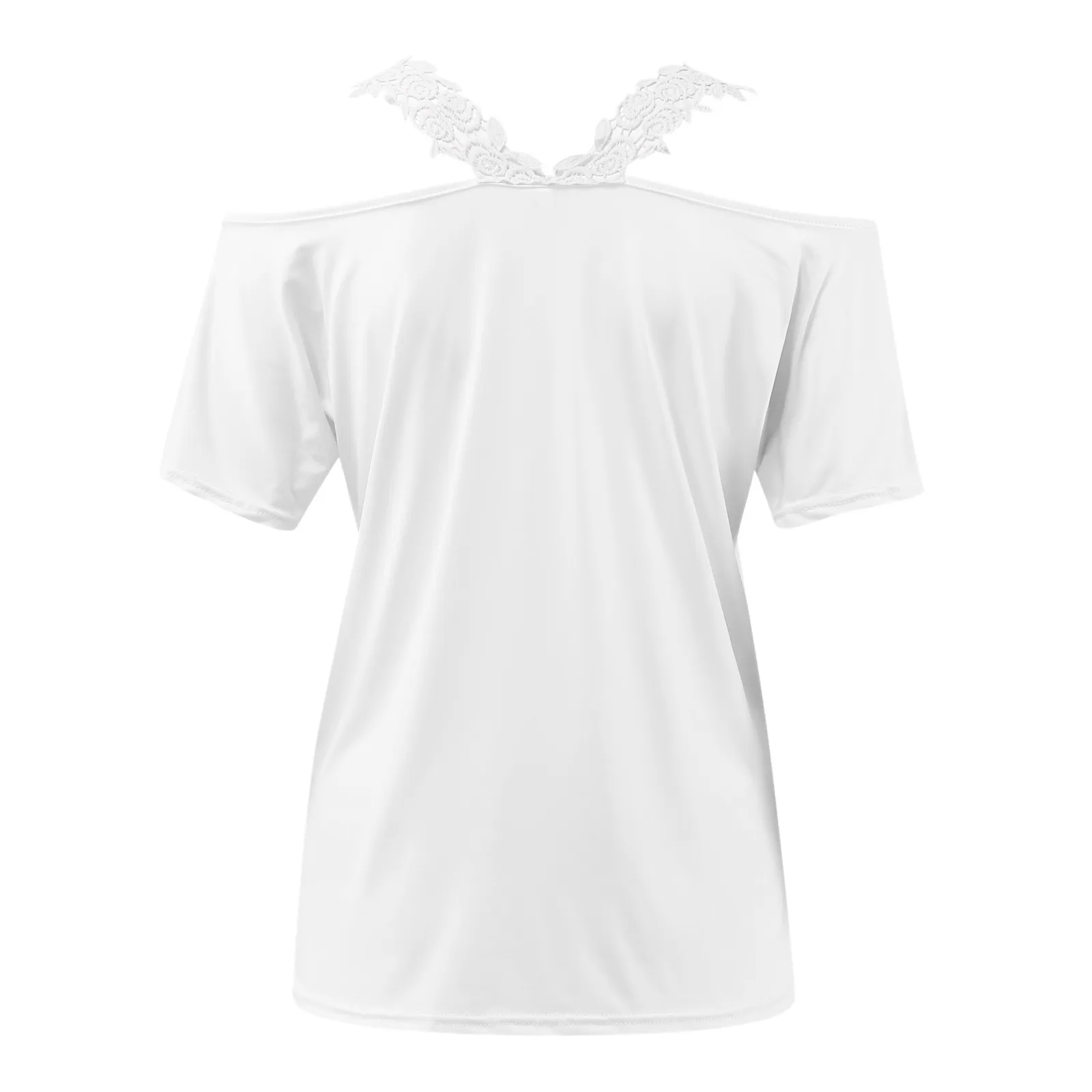Sexy Cold Shoulder Blouse for Women – Elegant Lace Stitching Short Sleeve Casual Top