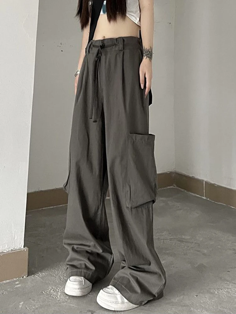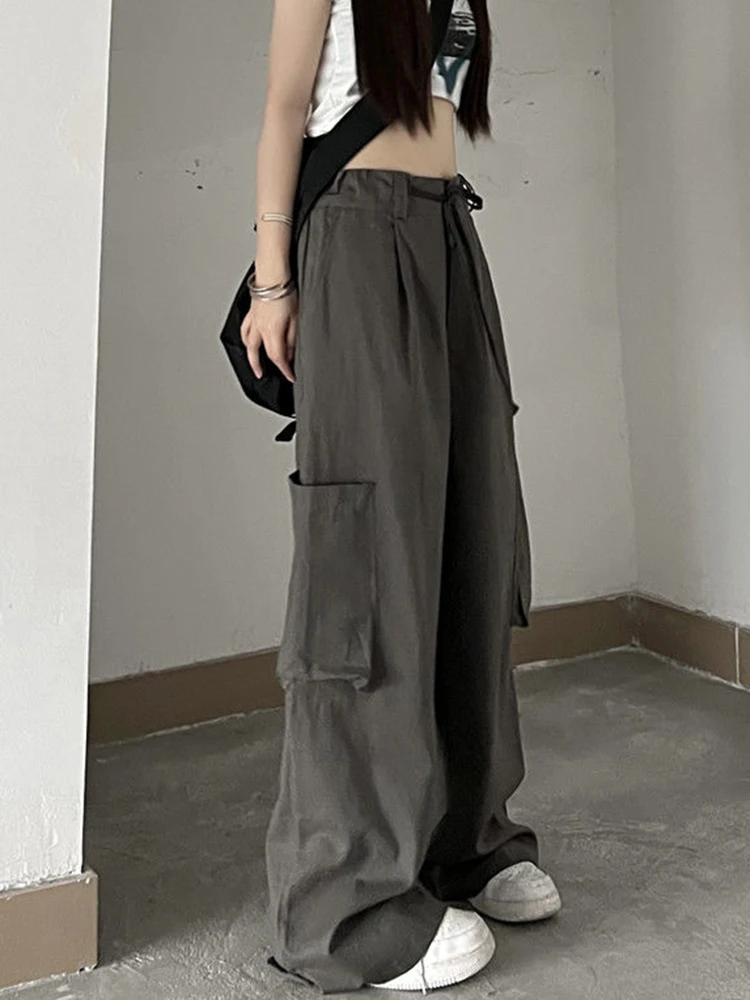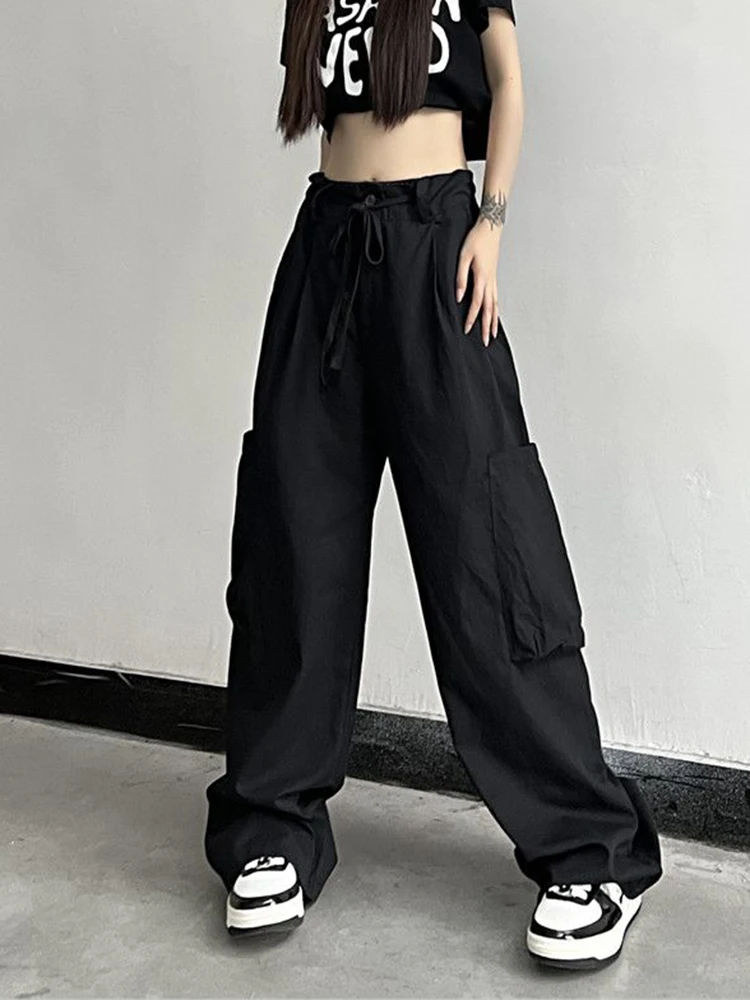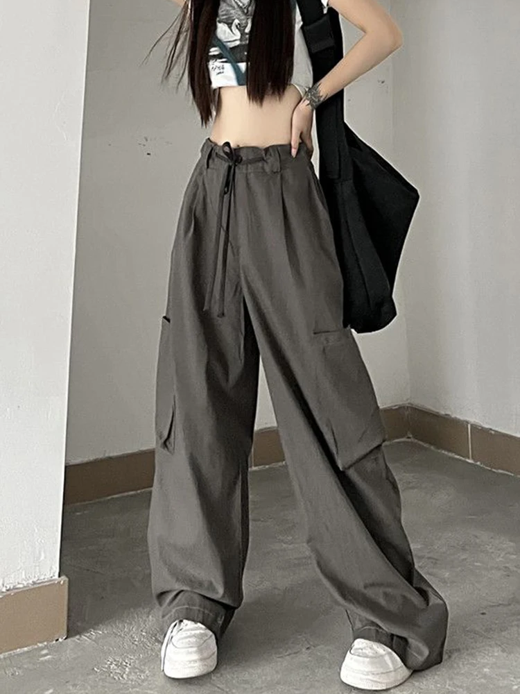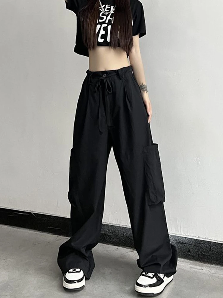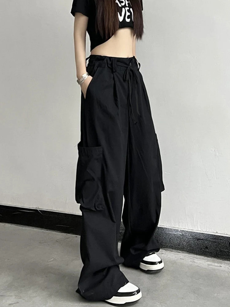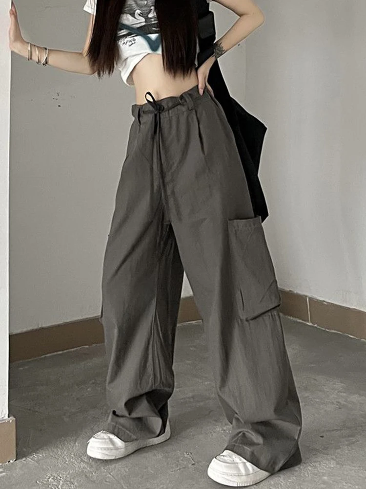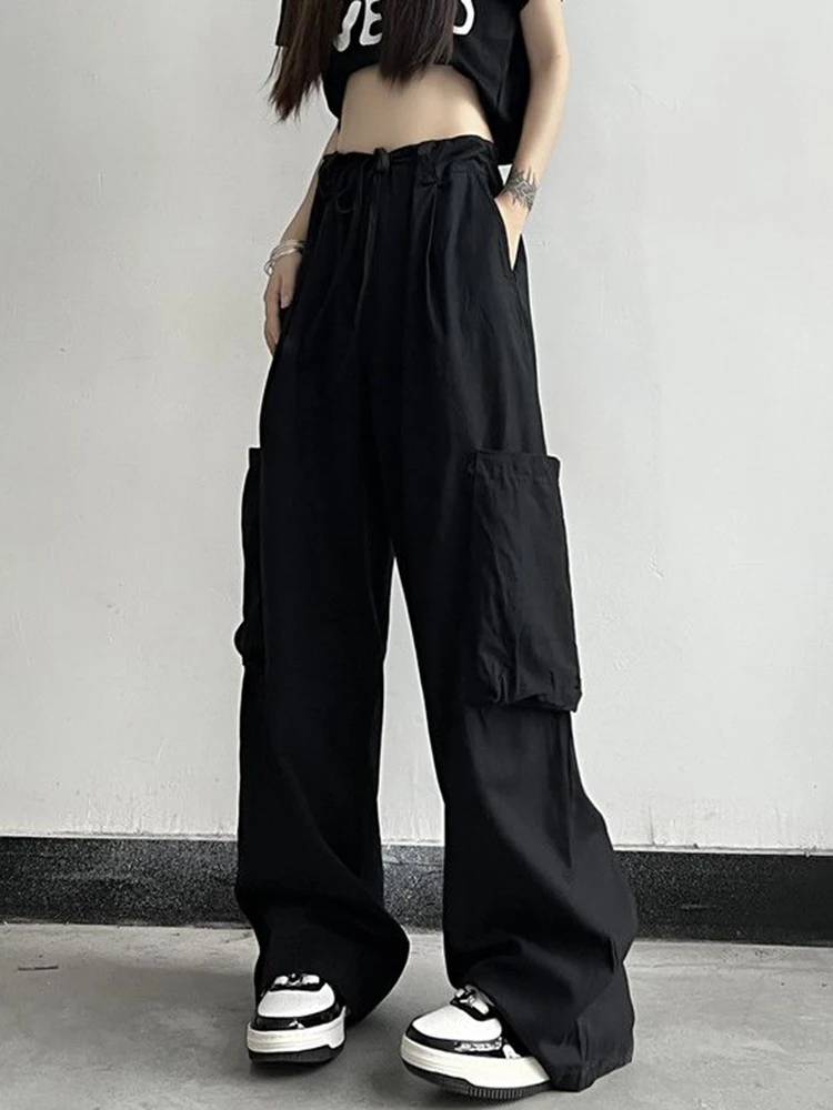 Streetwear Y2K Big Pocket Cargo Pants for Women Harajuku Vintage Parachute Pants Elastic Waist Solid Casual Wide Leg Pants